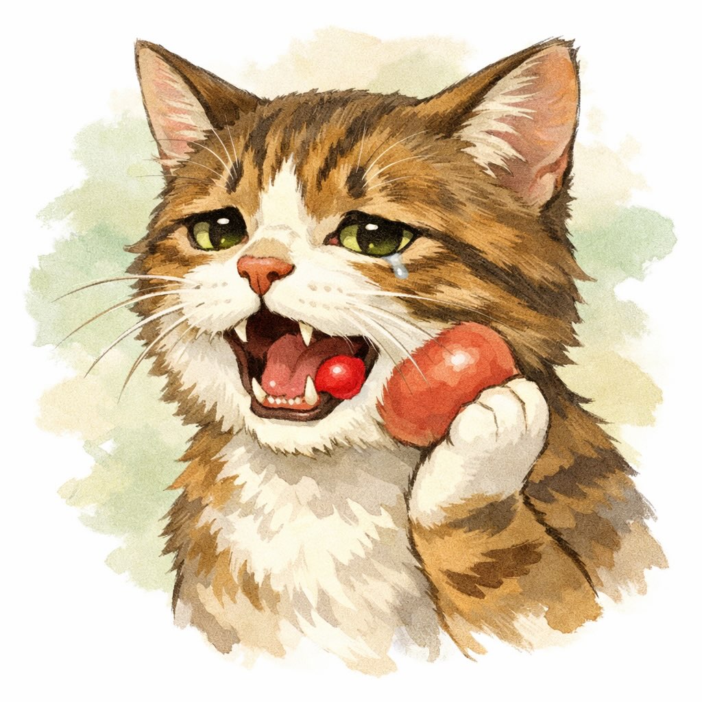 今回の診察では、全身を丁寧に診察しました。その結果左下顎に腫れが見られ、歯茎に触れると出血が確認されました。このような症状は(イラストは大袈裟ですが・・・)なかなか口の中を見せてくれない猫ちゃんでは見過ごされがちで、さらに長毛種ではしっかり触って初めてわかるということもすくなくありません。