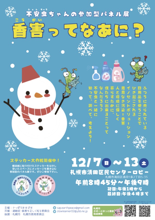 札幌市清田区民センターにて開催される香害(こうがい)に関する参加型パネル展のご案内です。