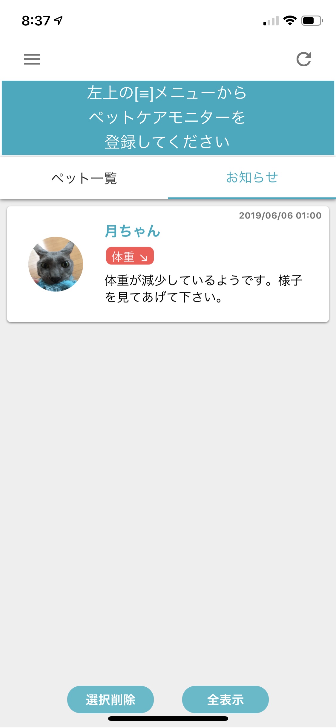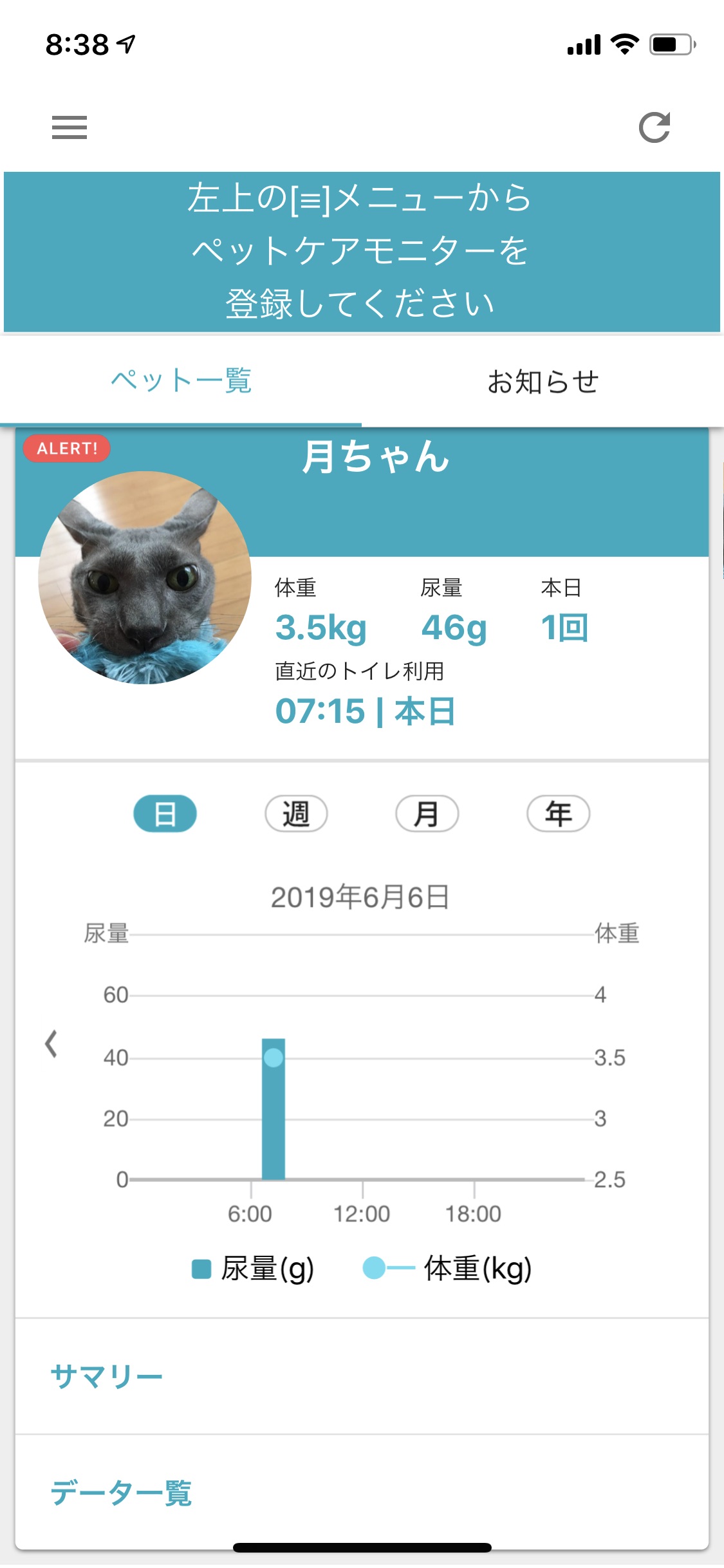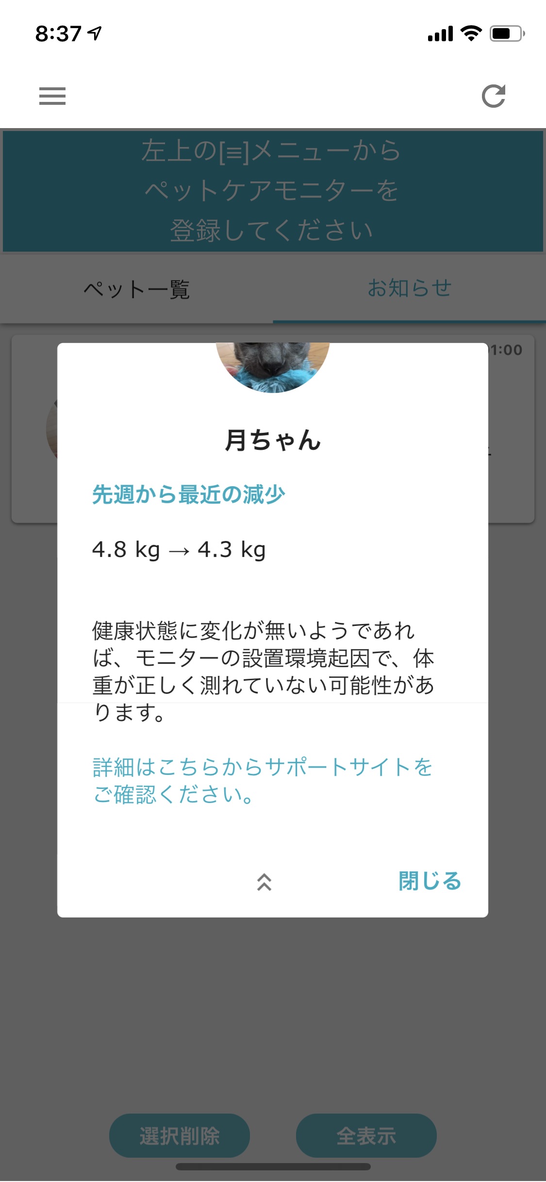 アラートをチェックすると、どうやら体重が減っているということ。月ちゃんは腎臓が悪いので、体重の変動は重要な健康状態のバロメーターです。
